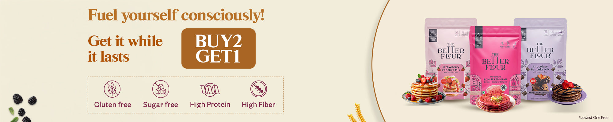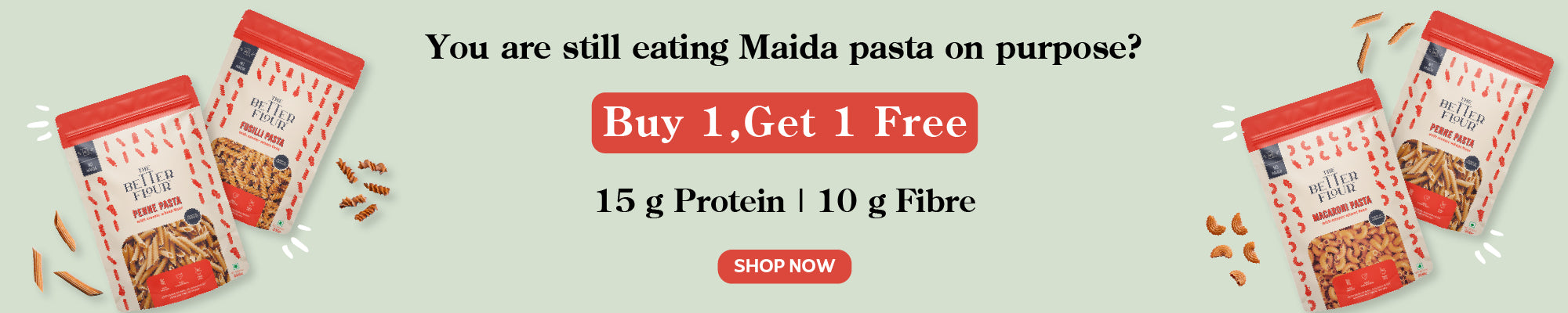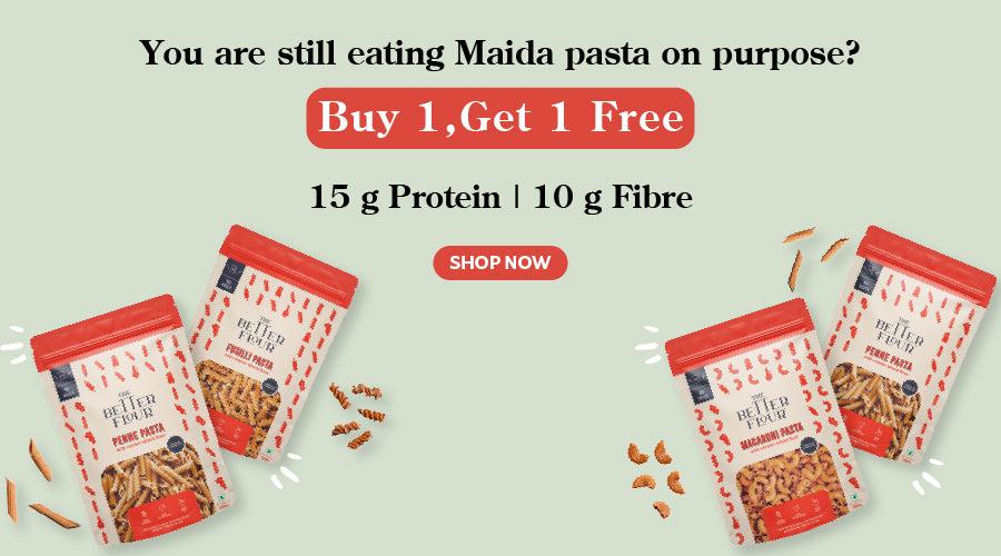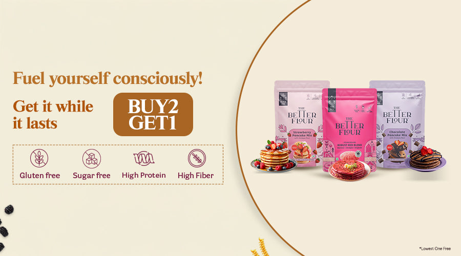 The Better Flour’s full product collection includes a diverse, health-focused range of gluten-free flours, pancake mixes, and Emmer wheat pastas. Notable flour blends are the Original Blend (white chickpeas, rice, sorghum, lentils), Lean Green Blend (chickpeas, spinach, lentils), Robust Red Blend (chickpeas, beetroot, sorghum), and Khapli Wheat Blend (emmer wheat, carrot, tomato). These flours are high in protein, fiber-rich, low glycemic, diabetic-friendly, and free from added sugar or preservatives. They support digestion, weight management, and meet dietary needs across ages.