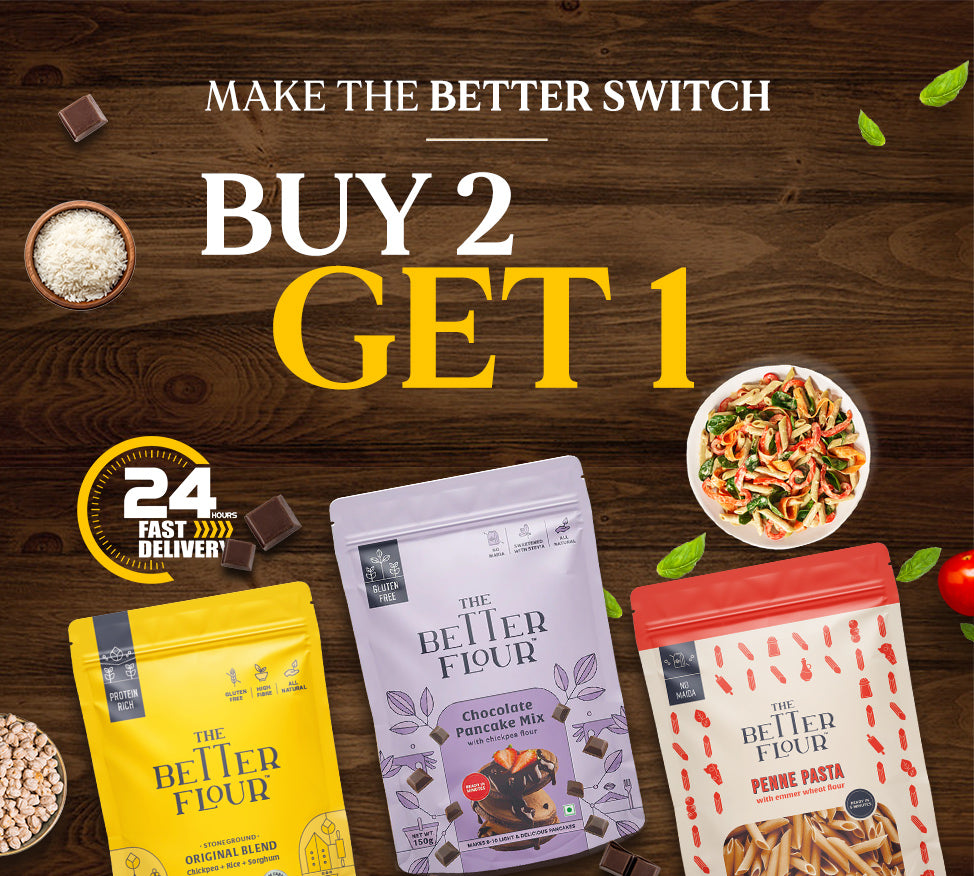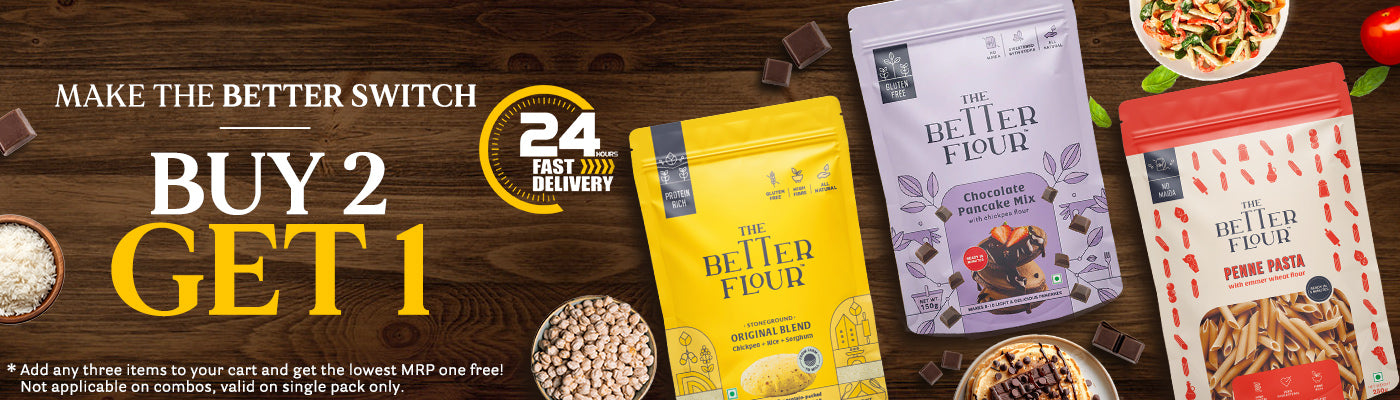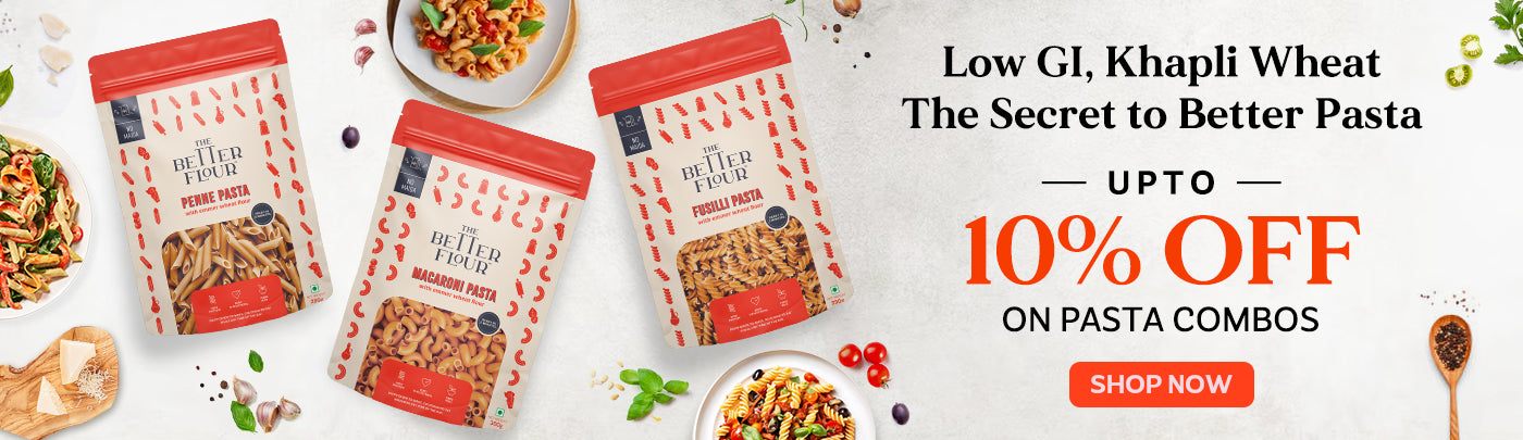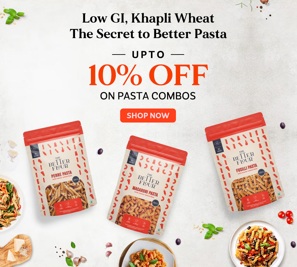 The Better Flour Khapli Wheat Pasta collection offers high-protein, low glycemic, and diabetic-friendly pasta options made from 100% Emmer wheat (also called Khapli). Available in Fusilli, Macaroni, and Penne shapes, these pastas cook quickly in 2 minutes and contain no maida, preservatives, trans fats, or cholesterol. They are rich in dietary fiber and antioxidants, promoting heart health and digestion.