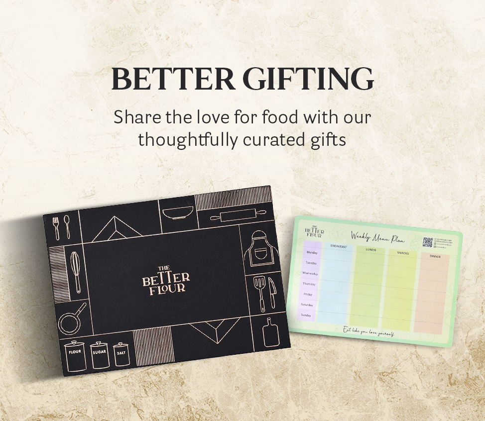 The Better Flour merchandise collection offers a range of wholesome, nutrient-rich products designed for healthy cooking and mindful eating. Their lineup includes gluten-free flour blends such as the Original Blend, Lean Green Blend, and Robust Red Blend, each rich in protein, fiber, and free from added sugars. They also offer no-maida pancake mixes in flavors like banana, chocolate, strawberry, and blueberry, made with natural organic ingredients suited for diabetic-friendly and balanced diets.