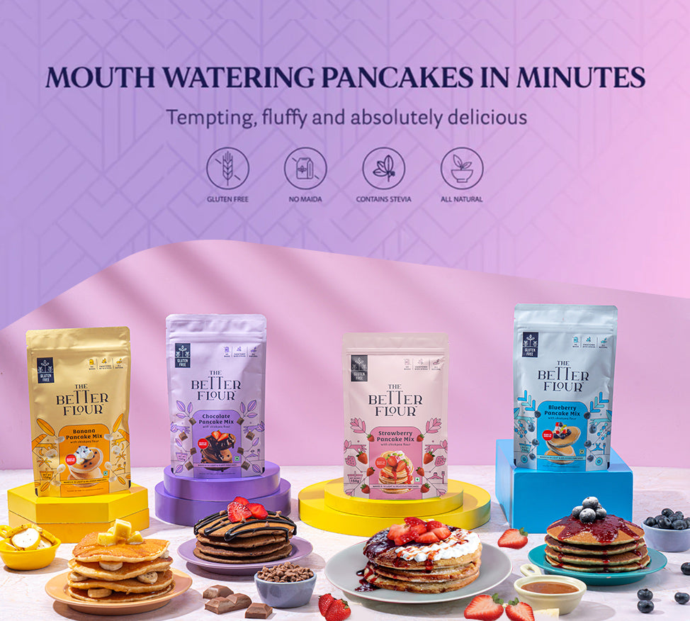 Chocolate + Banana + Blueberry + Strawberry (150g each)Pancake Mix Variety Combo (Assorted)No Maida | Protein Rich | Organic Flavours | No Refined Sugar | Fibre Rich