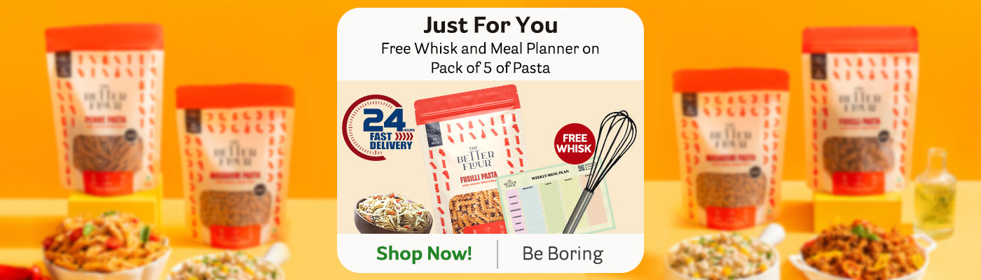 The Better Flour's pasta pack of 5 offers a selection of nutrient-dense pastas made from Emmer wheat, known for its high protein, fiber, and low glycemic index. This pack usually includes varieties like Penne, Fusilli, Macaroni, and other shapes, all free from maida, preservatives, and cholesterol. Their slow-releasing complex carbohydrates help regulate blood sugar and provide sustained energy throughout the day.